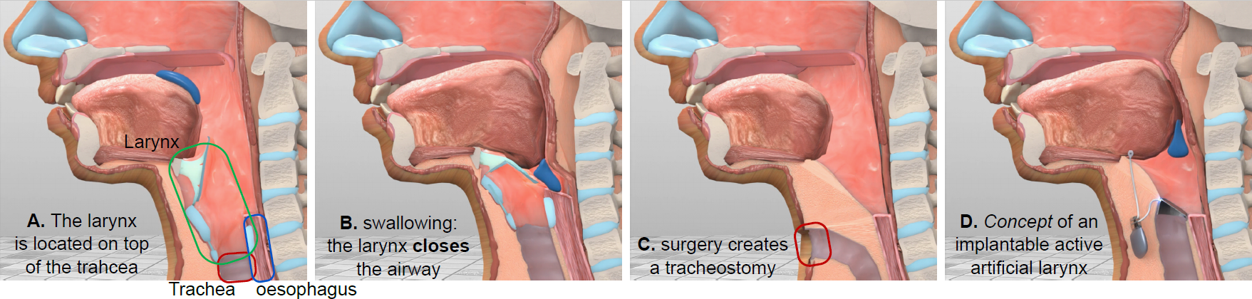 Located in the throat, above the trachea, and sharing a common passage with the esophagus, the larynx is a multifunctional organ primarily involved in phonation, respiration, and swallowing. It contains the vocal cords, is capable of regulating the flow of air entering and exiting the lungs, and offers a complex airway protection mechanism during swallowing, to prevent any misdirection of the food bolus. In cases of advanced cancer, the standard treatment involves the complete removal of the larynx, called total laryngectomy. Consequently, the functions of the larynx are lost and partially and suboptimally restored through surgery, with the creation of a tracheostomy. This involves suturing the trachea to the front of the neck, effectively addressing the loss of the laryngeal airway protection mechanism but also permanently separating the airway from the digestive tract.