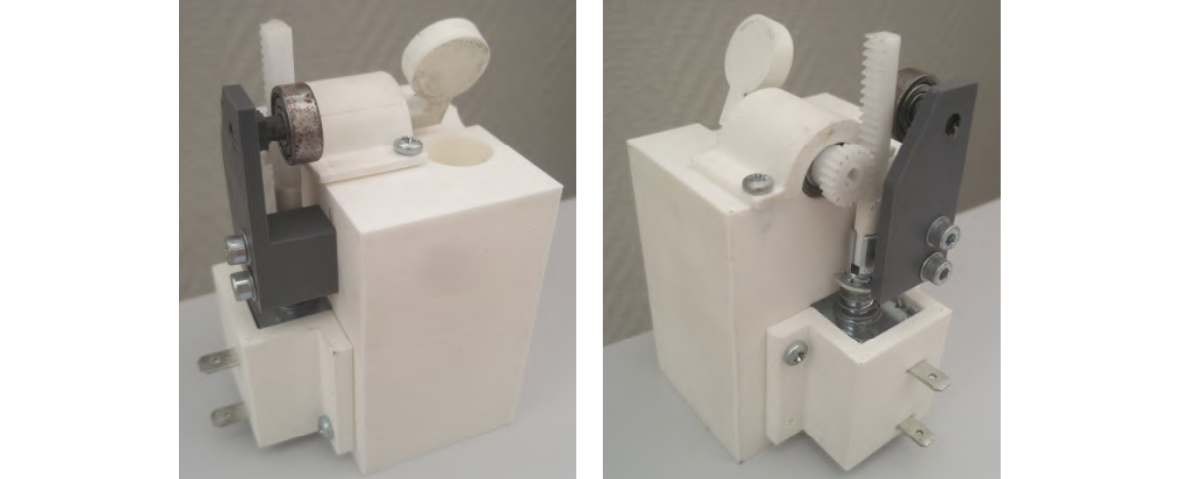 The second part of the prototype consists in the protective mechanism, that is actuated by the microcontroller when a swallowing is detected. A logical output is used to control a power circuit that, in turn, control a latching solenoid. The latter being a solenoid able to stay in its actuated position, without the need to maintain the source of power, which allows to reduce the power consumption. The solenoid then rotates a valve 90 degrees, that closes a cylinder representing the airway. To estimate the time required to close the vavle, the system was filmed with a high-speed camera (1000 fps). When a swallowing was detected, a LED was turned on on the microcontroller, right before it activates a logical output. The functioning time of the protective mechanism was therefore the time elapsed on the camera between the moment the LED turned on and the moment the vavle was entirely closed. Then, the results show an actuation time of 22 milliseconds. The closing mechanism can be seen in the following figure.