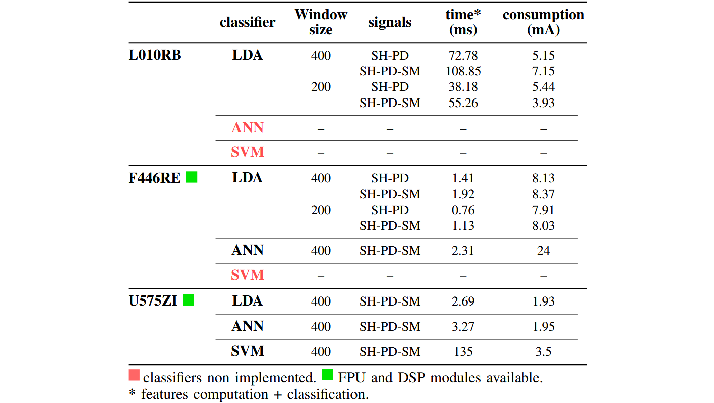 It functions by receiving signals from the computer, that sends them one sample after another, at the same frequency they have been acquired during the clinical research protocol. The microcontroller then runs a machine learning algorithm using the latest N number of samples of the incoming signals, and N is usually chosen to be small to increase the frequency at which the signals are analysed. The algorithm then classifies the data as a swallowing or non-swallowing event. Three low-power microcontrollers (STM32L01RB, STM32F44RE, STM32U575ZI) and three machine learning algorithm (LDA, SVM, ANN) were implemented, and the results of their processing speed analysis can be found in the following figure. First, apart from the very technical aspects of the figure, it implies that two of the classifiers provide very short processing time, as referred to the “time (ms)” column (in milliseconds), when processed with the microcontrollers that have modules specialised in signal processing (FPU and DSP modules). Second, three classifier where not implemented on microcontrollers, either because the processing time was way too slow to fit within our requirements or because the memory requirement was too large.